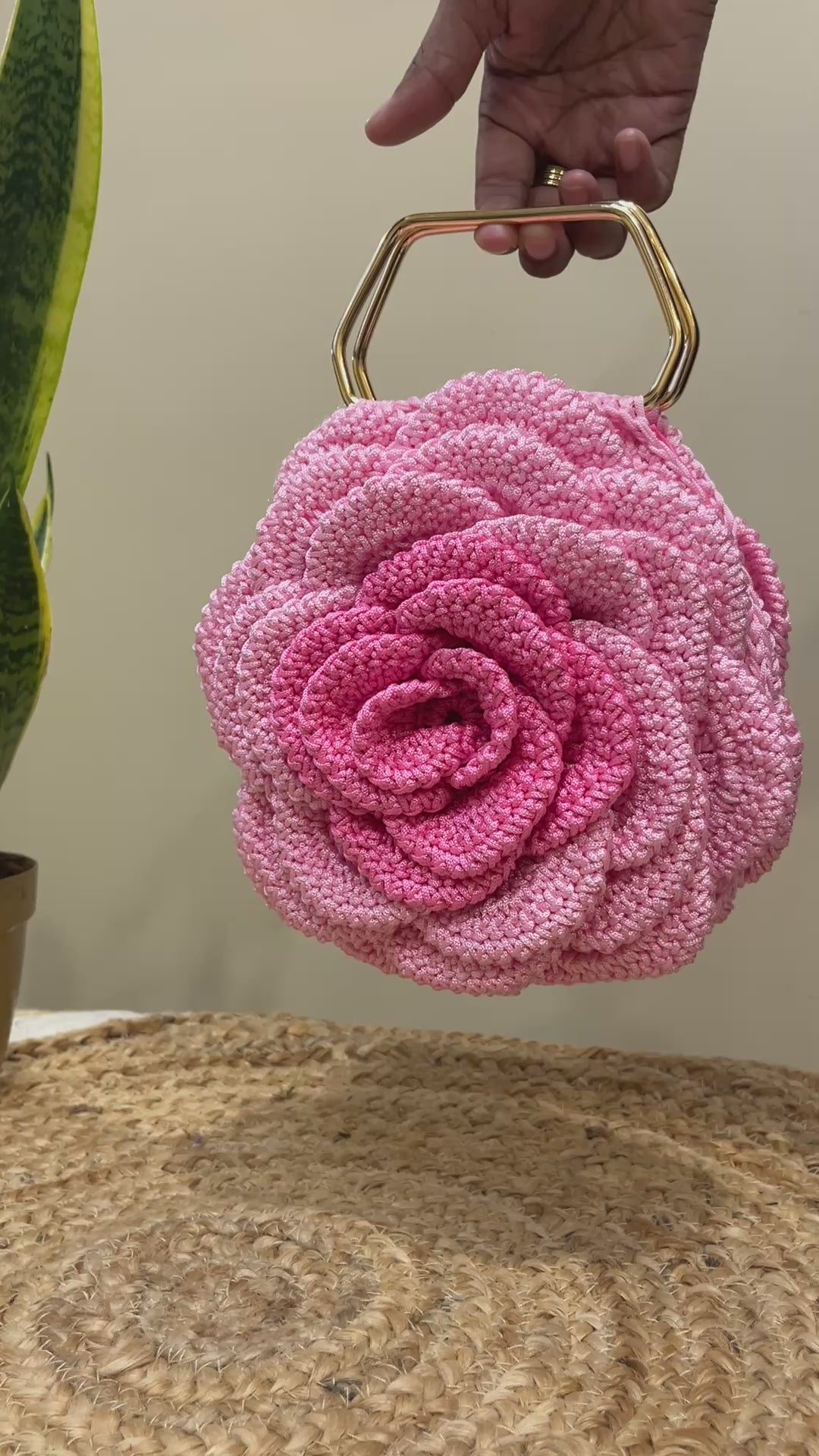 Elevate your style with the Rosalia Bloom Clutch, a captivating 3D handcrafted crochet rose purse. Featuring delicate pink petals and a chic gold-tone top handle, this floral accessory adds a refined touch to any outfit. Perfect for weddings, celebrations, or evening wear, it’s sure to be a head-turning statement piece.