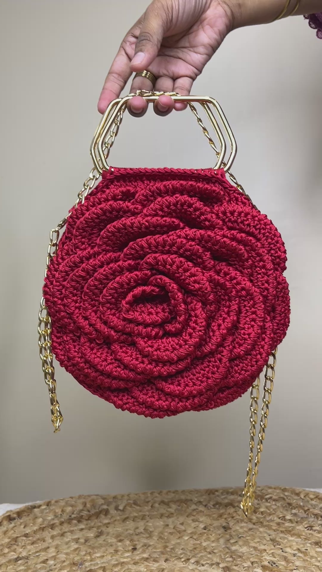 Make a passionate statement with the Rosalia. An artisanal showstopper designed in the form of a bold, deep red crochet rose. Carefully hand-stitched petal by petal, this purse adds a dramatic romantic flair to any outfit. With a minimal yet striking gold-tone rectangular handle, this clutch blends elegance with pure craftsmanship.